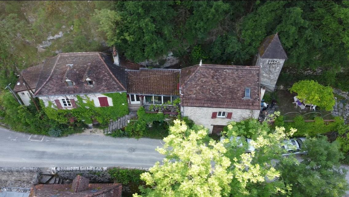 Maison Ancienne lotoise en pierre avec pigeonnier dans un petit vallon bien exposé à deux pas de Saint Cirq Lapopie composée de deux bâtisses reliées par une veranda: