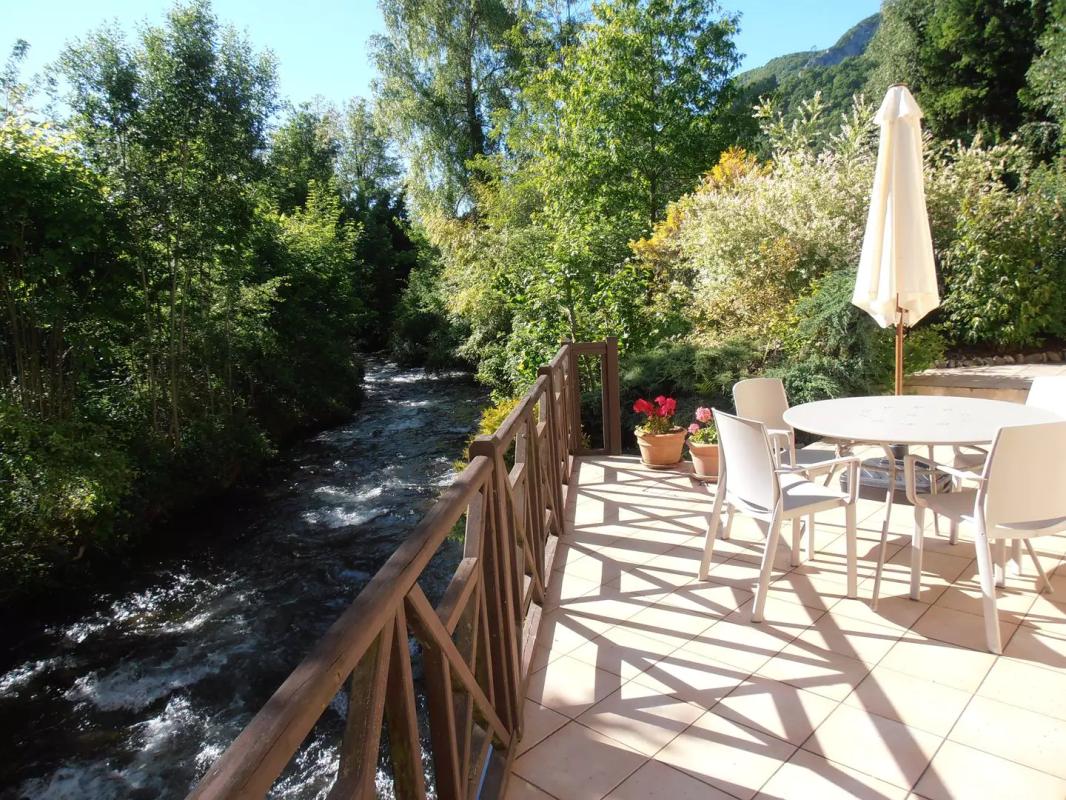 Extérieur : grand espace parking, parc arboré avec bassin et jardin. La rivière borde le parc et la maison par le Nord avec une chaussée, tempérant la chaleur estivale et réchauffant l'air en hiver.