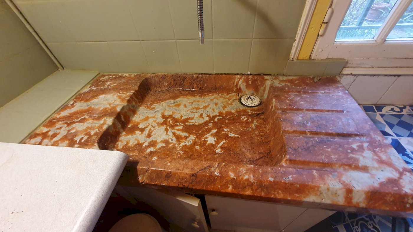 Cachet ancien : évier en marbre rose du Canigou, revêtement de sol en carreau ciment ( salle-à-manger et chambres), moustiquaires métalliques.