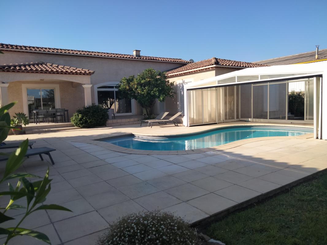 Villa T5 de 135m² orientée plein SUD sur terrain de 1246m² totalement clôturé avec portail électrique + jardin + potager avec arrosage automatique sur forage ainsi qu'une piscine.