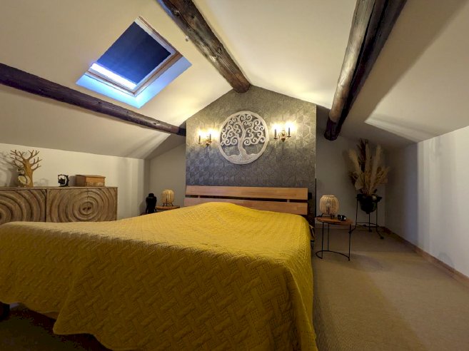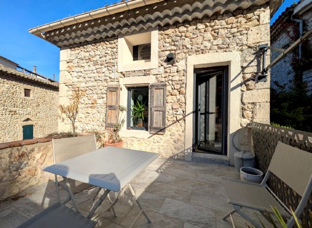 Maison en pierres apparentes, dans un authentique village médiéval en ruche, accroché à sa colline. La maison comprend 2 appartements séparés. Un appartement de75m2 entièrement meublé, cuisine équipée, salon/séjour clim réversible +cheminée avec insert, 1 chambre/dressing et placards, 1salle d'eau et wc séparé. Terrasse couverte plein sud. Menuiserie double vitrage. Actuellement en location meublée. Revenu annuel 7.200€. Un deuxième appartement de 75m2 accès indépendant par la calade. Entièrement rénové en 2023. Salon/séjour, poêle à bois, cuisine équipée, terrasse plein sud, salle d'eau, wc séparé, dressing. Menuiserie en triple vitrage, isolation des murs renforcée. 2 chambres en duplex et wc. Vélux. Grenier en sous pente. Pompe à chaleur Air/Eau. En rdc une cave voutée de 75m2 servant d'atelier ou de garage, comprenant une cuve de récupération d'eau de pluie de 8m3 avec pompe/surpresseur. Vente entre particuliers