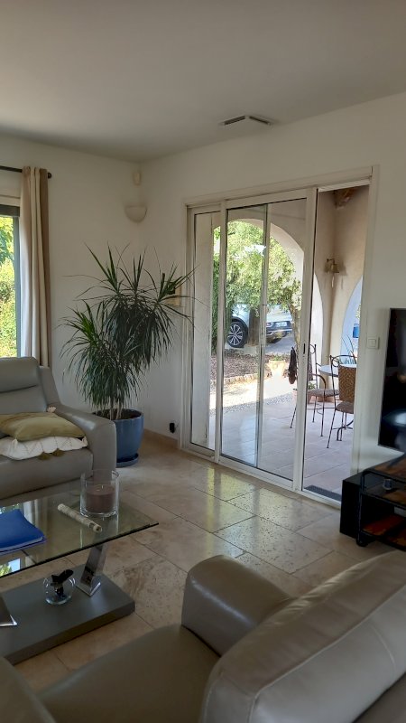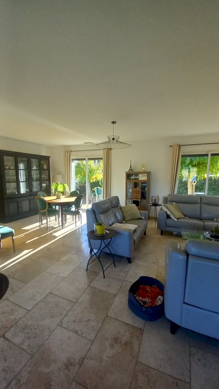 Grande villa de plain-pied, avec 4 chambres et 2 salles deau, 3 wc, salle de vie, avec cuisine américaine équipée de 70 m², très lumineuse, traversante, avec vue magnifique, 3 terrasses, chauffage et climatisation gainable, poêle à bois central.