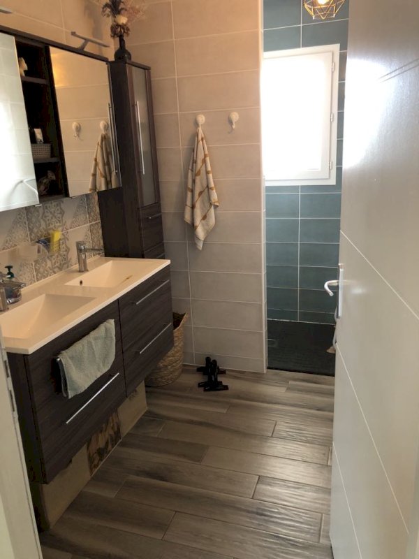 Une sdb de 5.16m2 avec double vasque et douche à l'italienne et d'un wc indépendant.