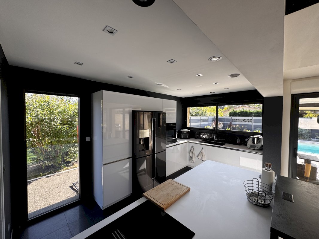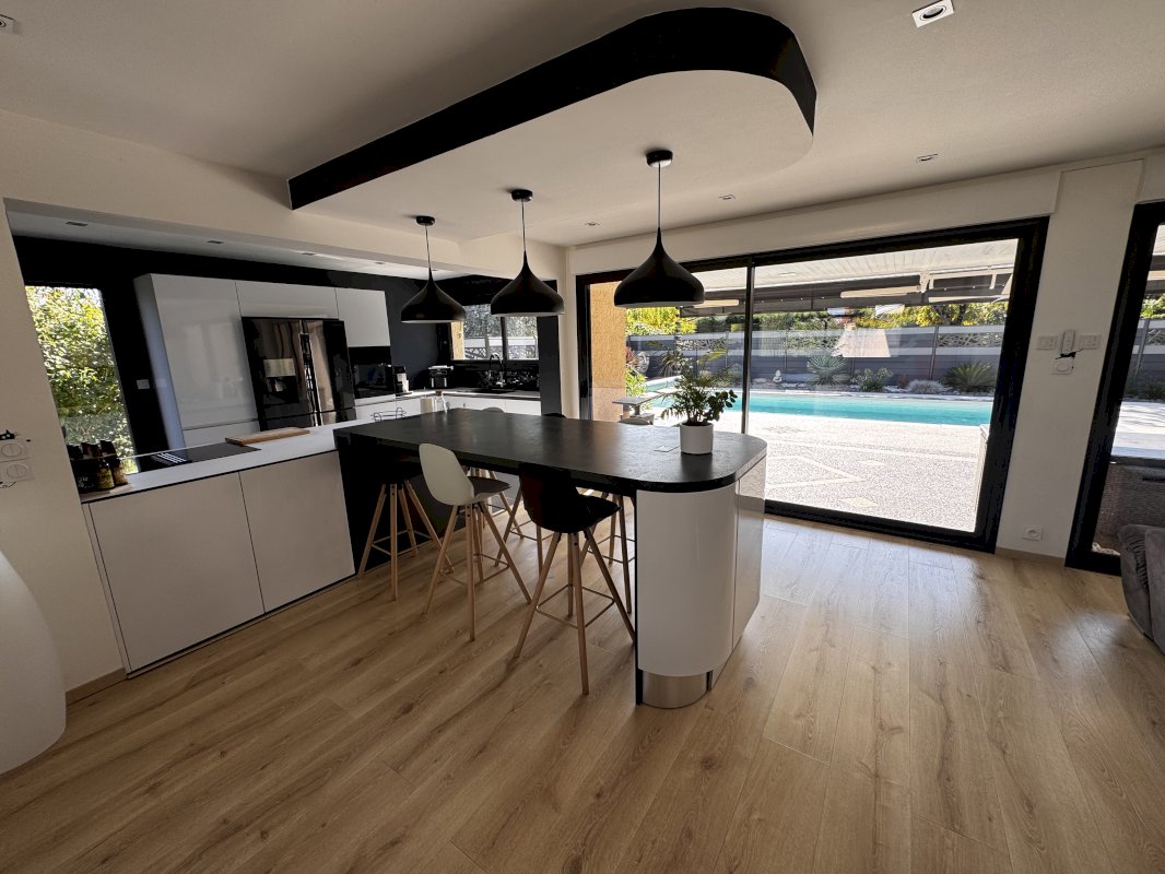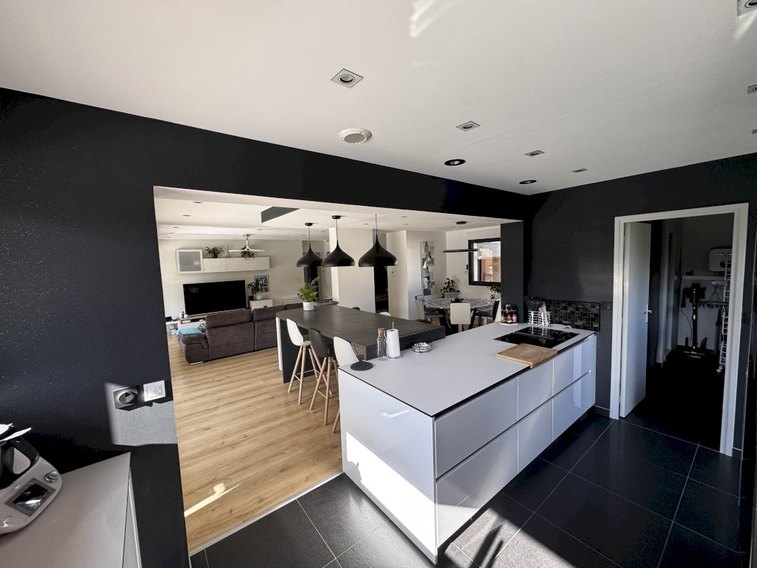 À l’intérieur, les volumes impressionnent : une entrée indépendante mène à une pièce de vie spectaculaire de 70 m², où séjour et salle à manger dialoguent avec une cuisine ouverte moderne, entièrement équipée, dans une ambiance à la fois contemporaine et chaleureuse.