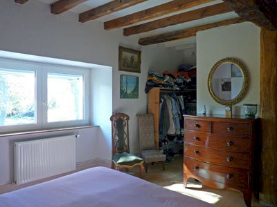 Chambre 1 : exposition SO - chevets 12m2 - poutres apparentes. Chêne d'origine woporte d'oden. Parquet neuf, volet roulant électrique.