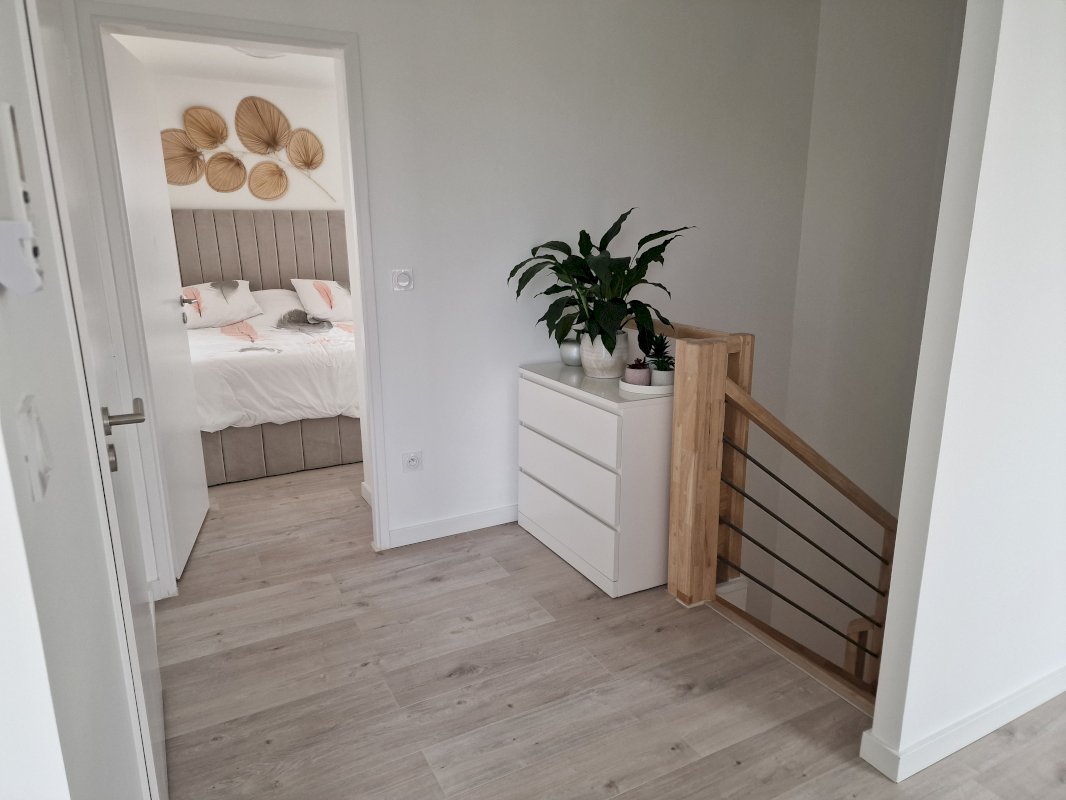 Au 1er étage, vous découvrirez 4 belles chambres avec placards intégrés et 1 salle d'eau (double vasque, wc suspendu, douche).