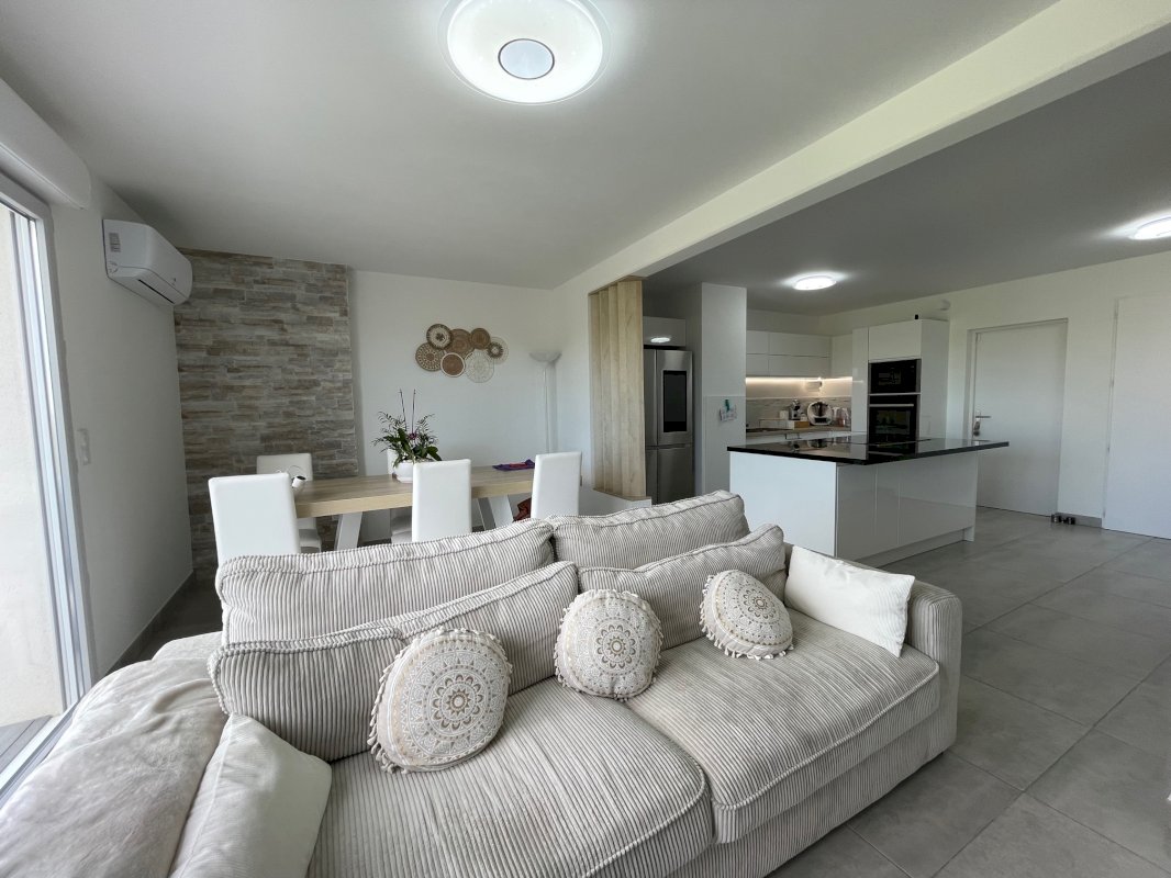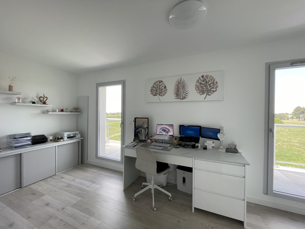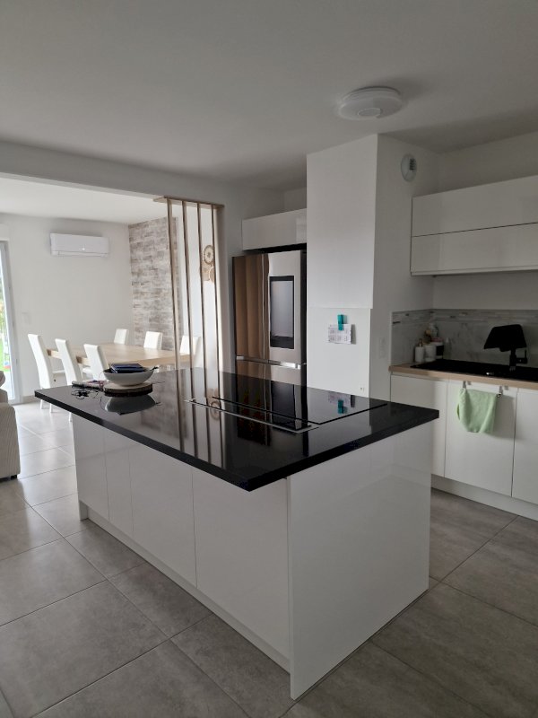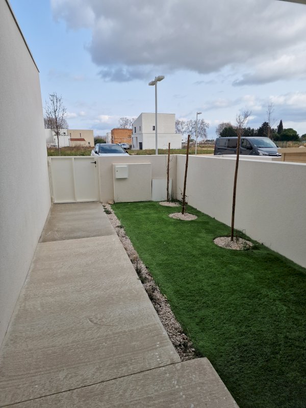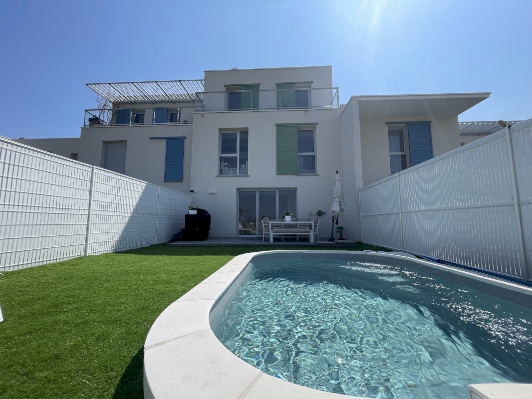 Villa récente de juillet 2022 d'une surface maison de 135m² avec son garage et cellier attenant et sa place de parking. Un jardin a l'avant de la maison et un jardin avec terrasse et piscine a l'arrière.