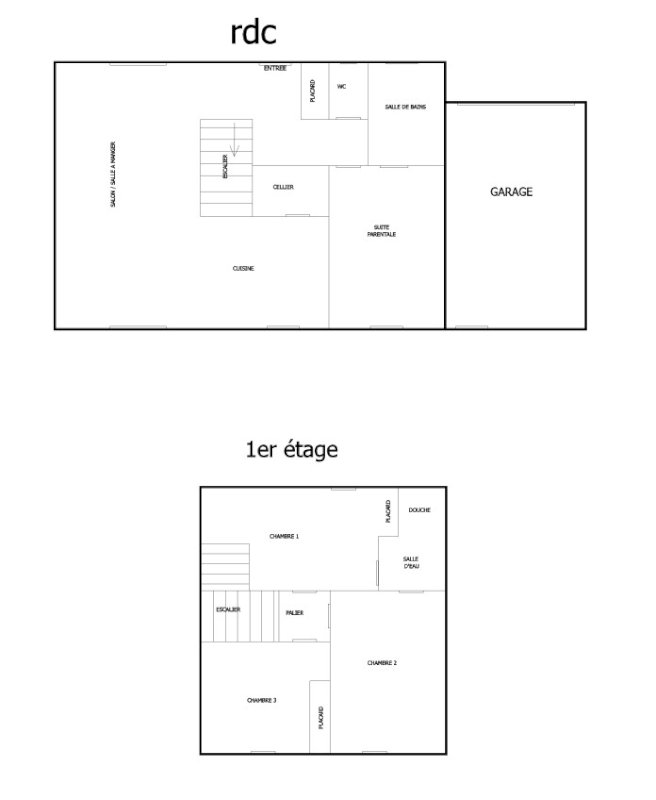 - au RDC d'un espace ouvert salon / salle à manger / cuisine équipée de 32 m², d’un cellier, d'un WC et d'une suite parentale comprenant une chambre de 11 m² et d'une salle de bain de 5 m² ;