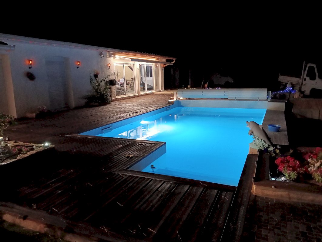 1 piscine chauffée de 7 x 4 carrelé à double système ( 2 skimmers et 3 refoulements ) ou en montant le niveau d’eau ( 4 refoulements et débordement ) + dans l’escalier 2 sorties balnéo, 1 dauphin qui crache de l’eau à la demande, douche solaire carrelé, sortie de la piscine sur 75 M2 de gazon synthétique pour profiter du soleil,