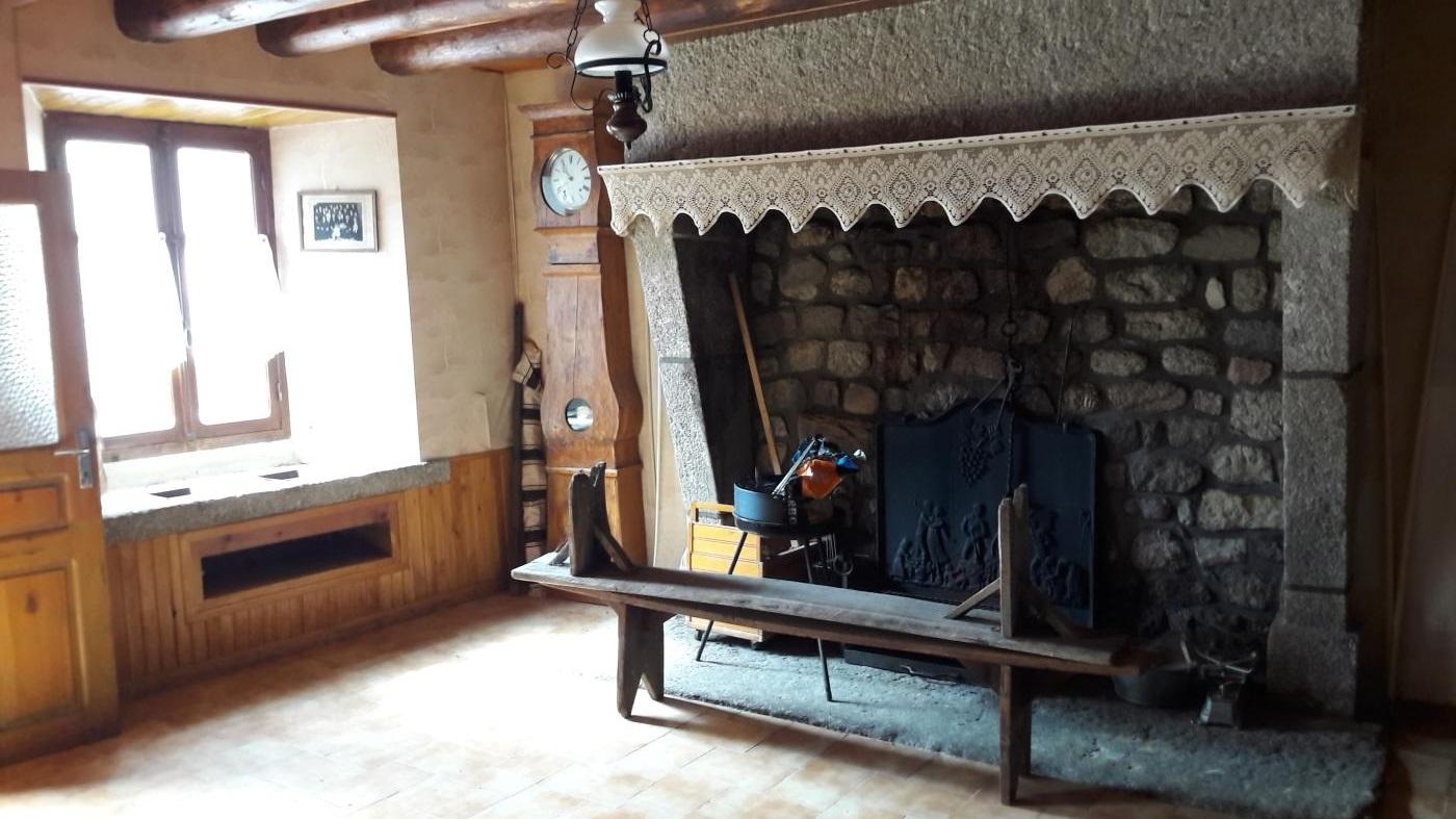 Salle à manger avec grande cheminée en pierre ( cantou), cuisine séparée avec cuisinière à bois alimentant 2 radiateurs dun rez de chaussée.
