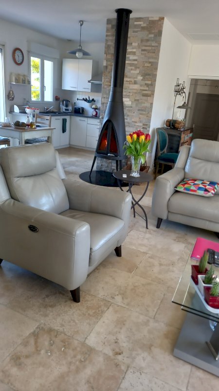 Grande villa de plain-pied, avec 4 chambres et 2 salles deau, 3 wc, salle de vie, avec cuisine américaine équipée de 70 m², très lumineuse, traversante, avec vue magnifique, 3 terrasses, chauffage et climatisation gainable, poêle à bois central.