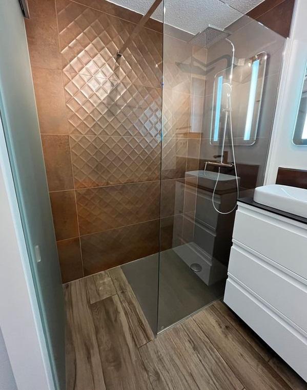 Salle de bain avec douche à l’italienne et porte coulissante en verre brossé (sèche serviettes et miroir à led).