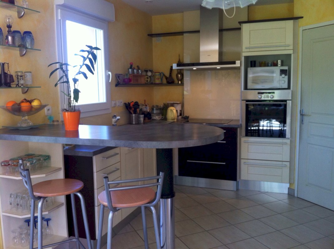 Elle a été construite en 2009 par le constructeur Carriere (Rodez), elle comprend 4 chambres, 2 SDB, 2 WC , 1 cuisine (chêne massif + électroménager SIEMENS), 1 salon lumineux (2 bais vitrées+ porte fenêtre), 1 garage en sous-sol d'une dimension de 100m2.
