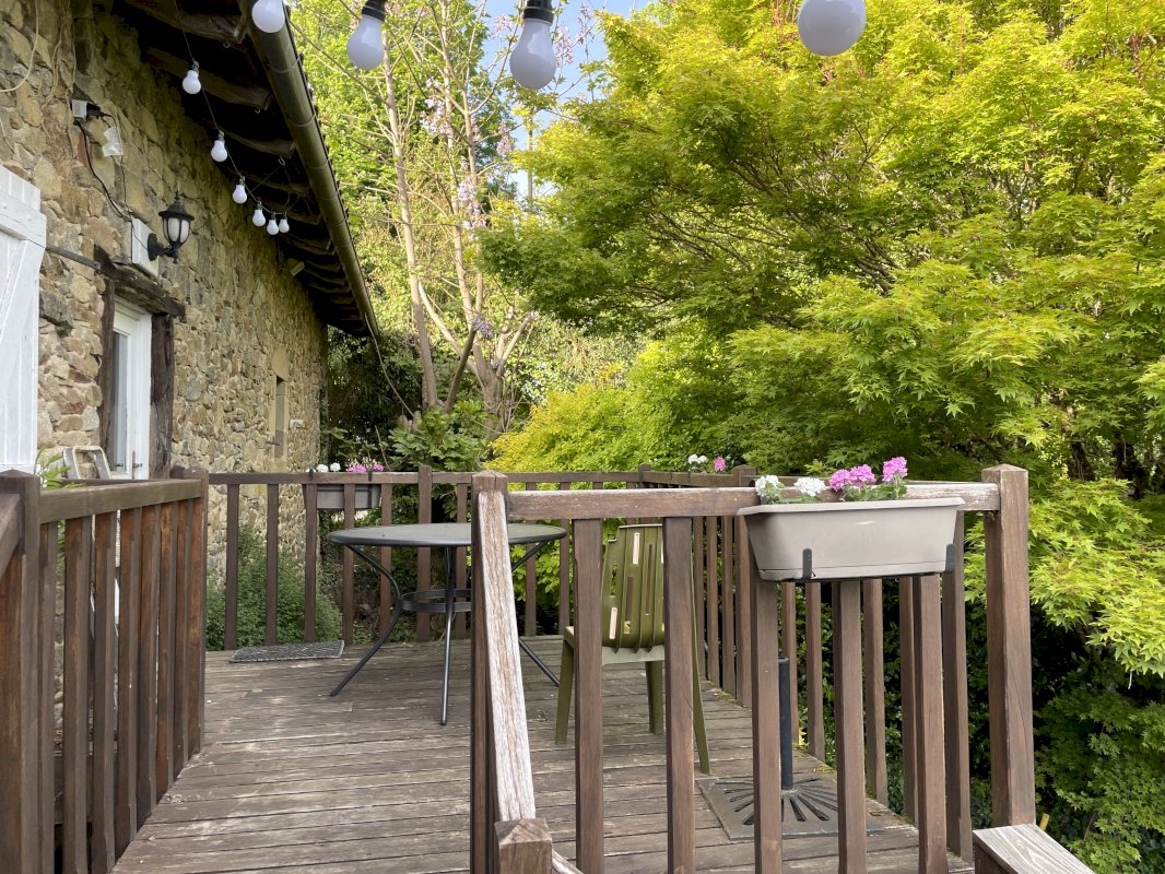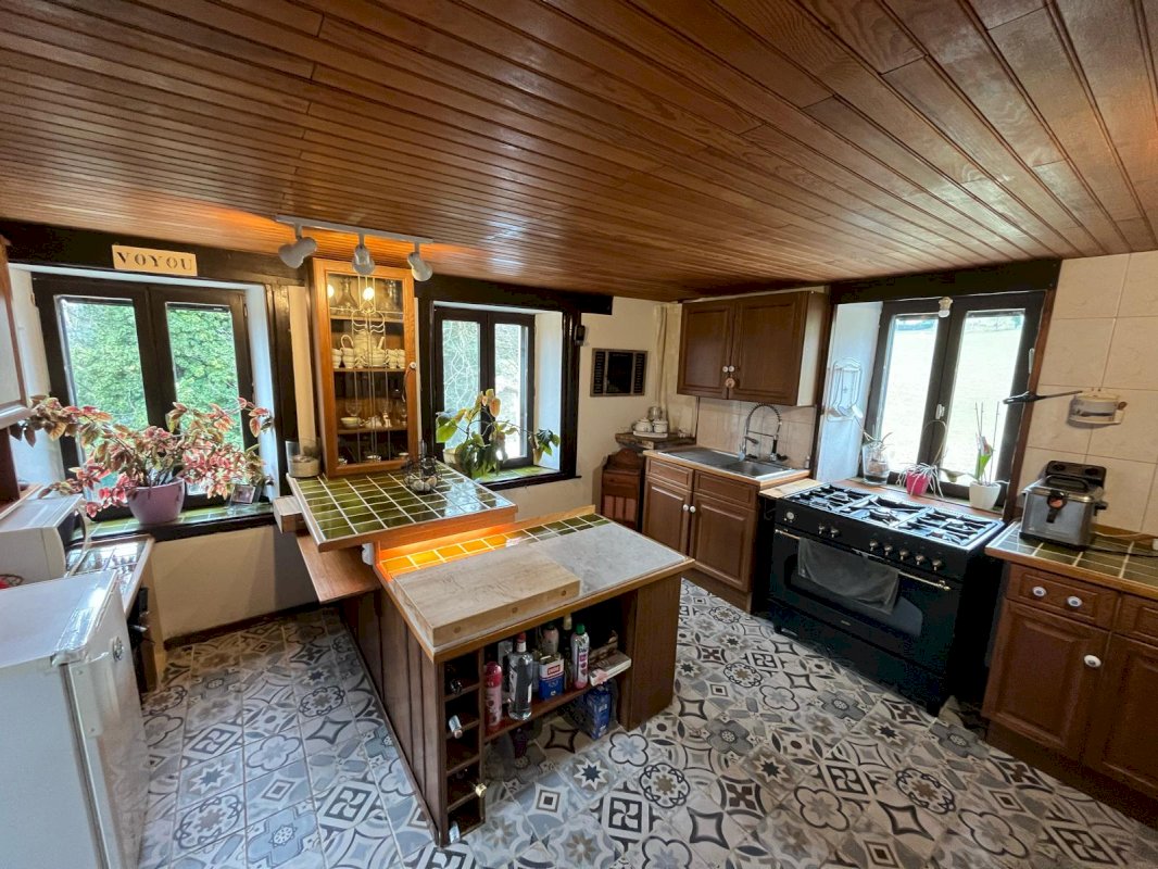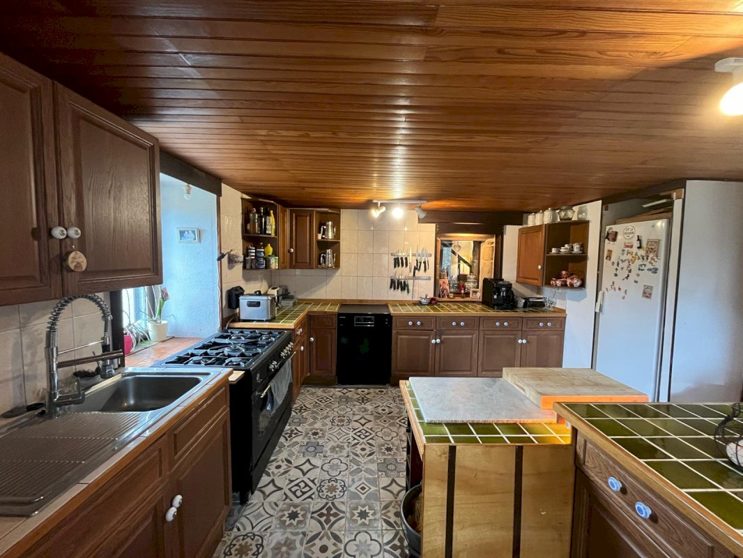 Entrée pièce de vie avec cantou (cheminée poêle), cuisine équipée et un WC séparée. À l’étage se trouve un bureau, deux chambres, une salle de bain avec un WC et une douche séparée. En RDC il y a une buanderie, un WC et un atelier.