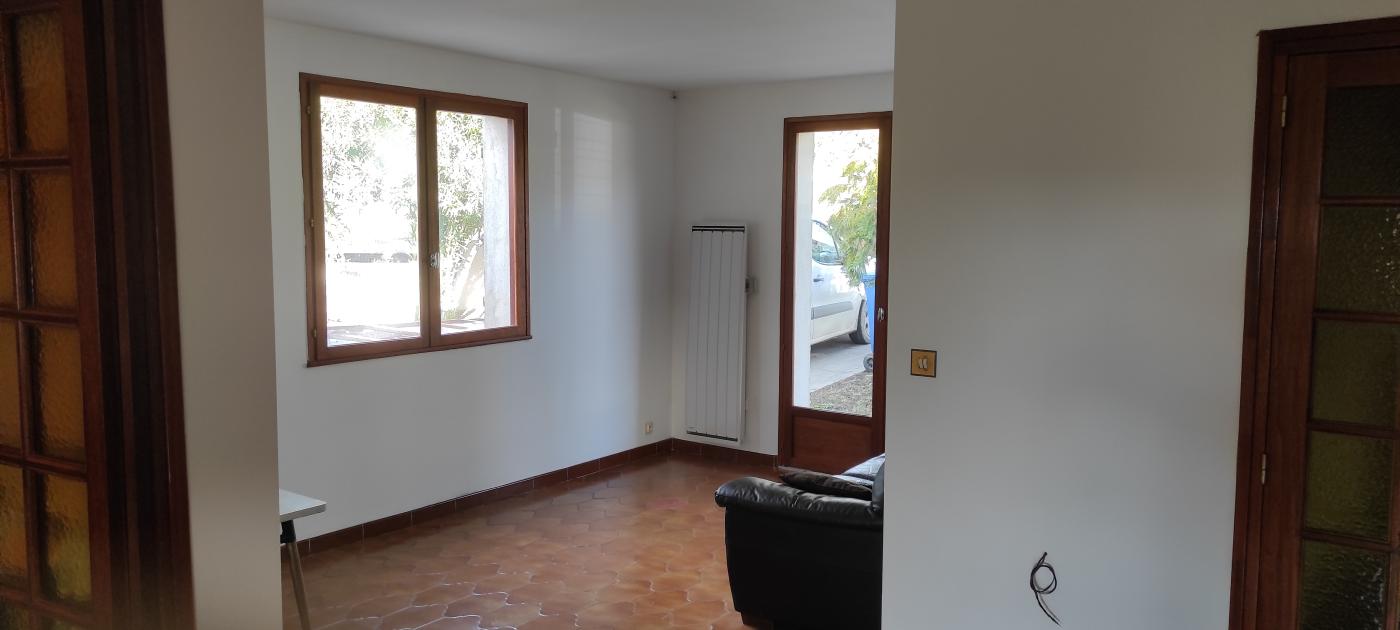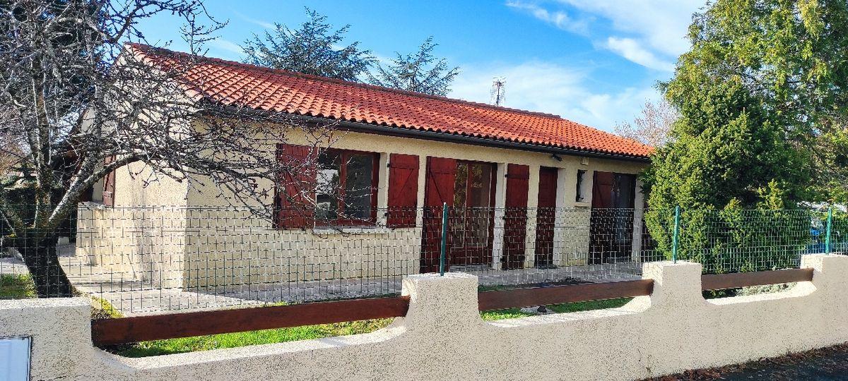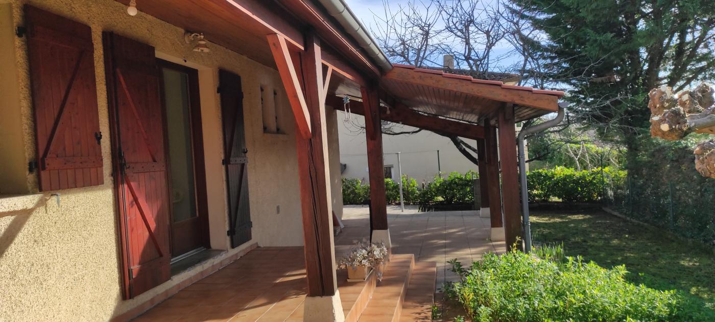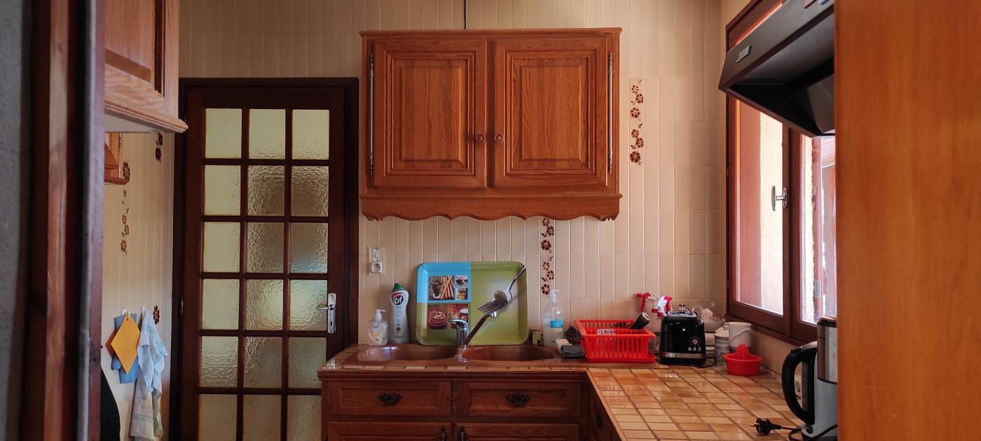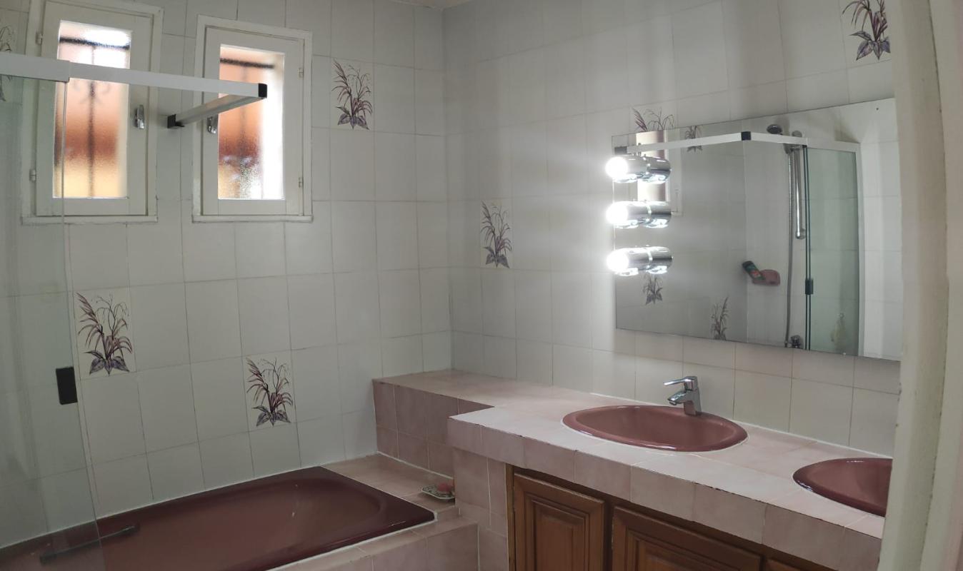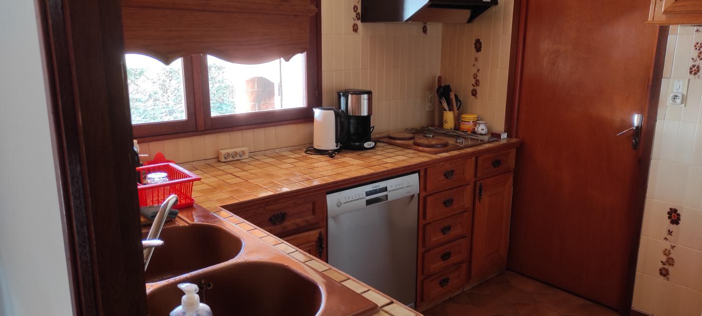 Villa T4, année 1980, 90 m² habitable de plain pied, 3 chambres (parquet flottant), SDB, WC, salon et salle à manger carrelée très ajourée. Cuisine indépendante aménagée et équipée avec porte sectionnelle donnant sur garage.