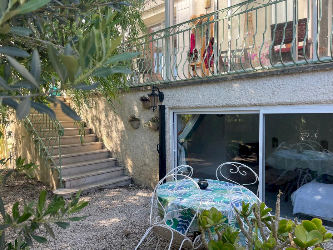 barbecue et de magnifiques fleurs et arbres (passiflore, jasmin, glycine, rosiers, olivier,