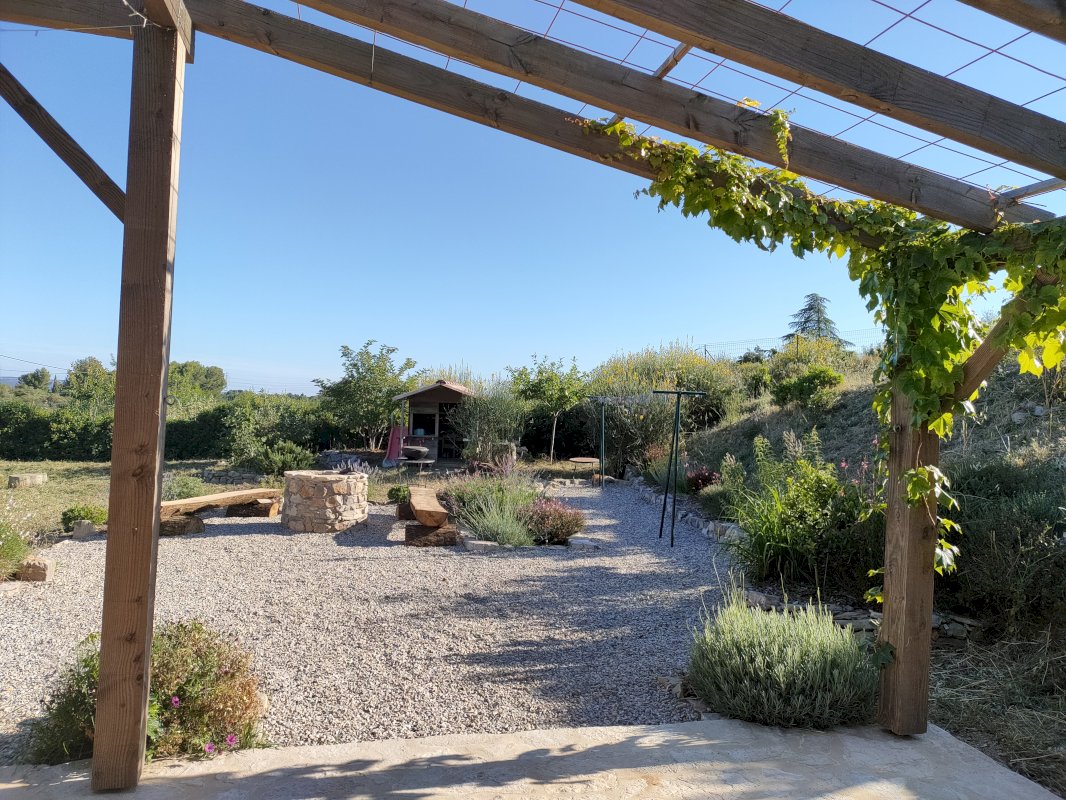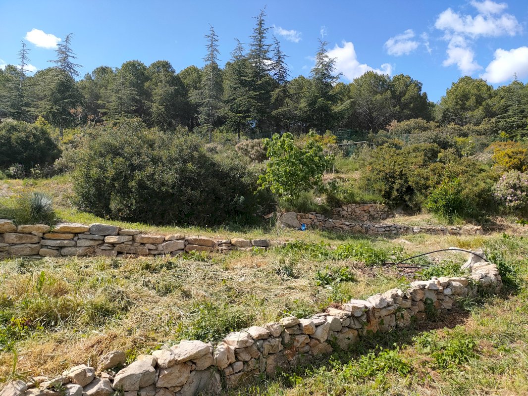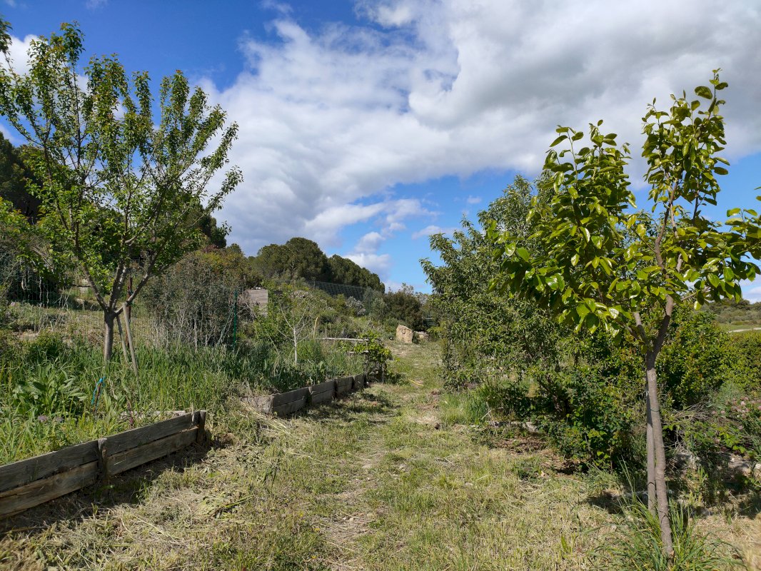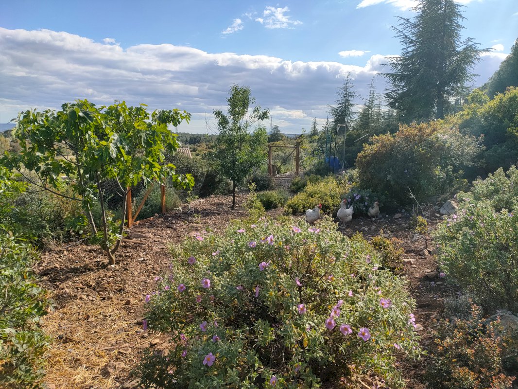 De nombreux arbres et arbustes fruitiers ont été plantés (oliviers, figuiers, pommiers, abricotiers, pêchers, amandiers, pruniers…) et une surface d’environ 150 m² de potager richement amendé a été équipée d’un système de goutte à goutte + électrovannes. On retrouve également une partie aménagée pour l’élevage de volailles avec poulailler.