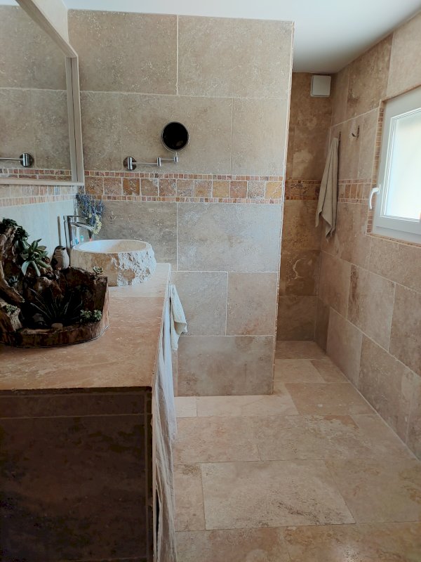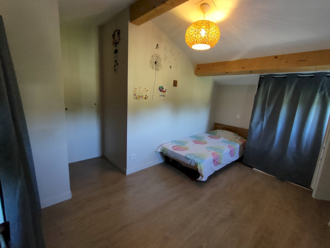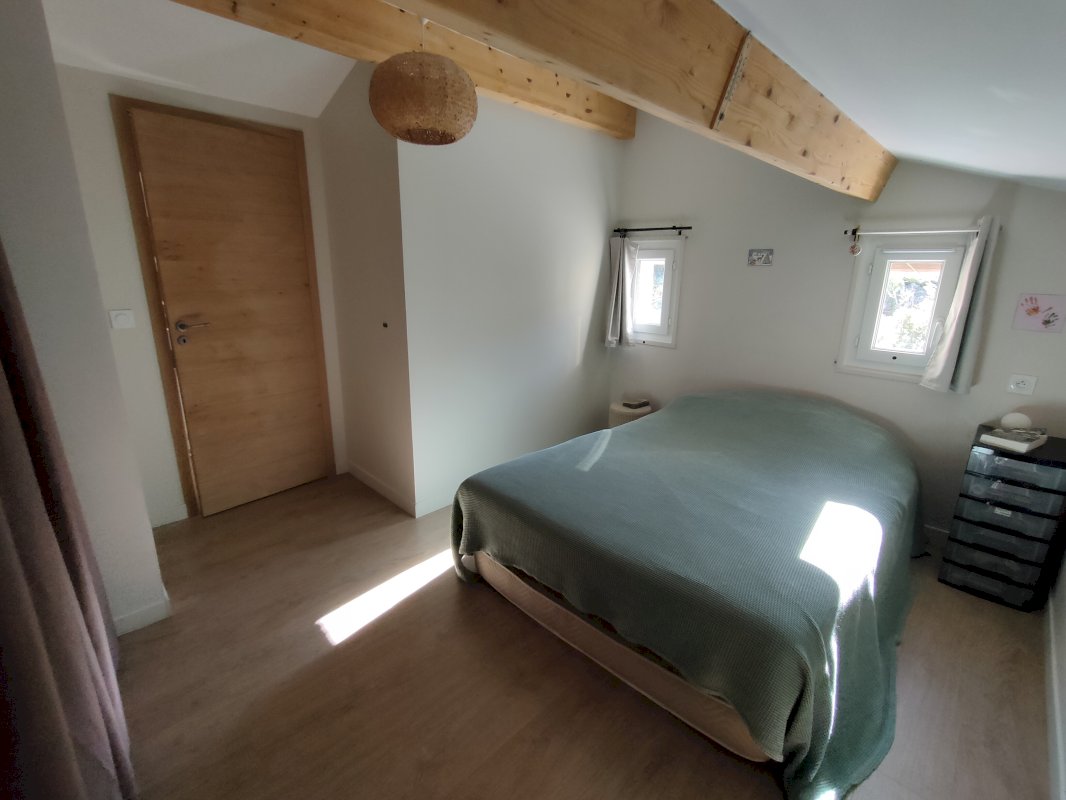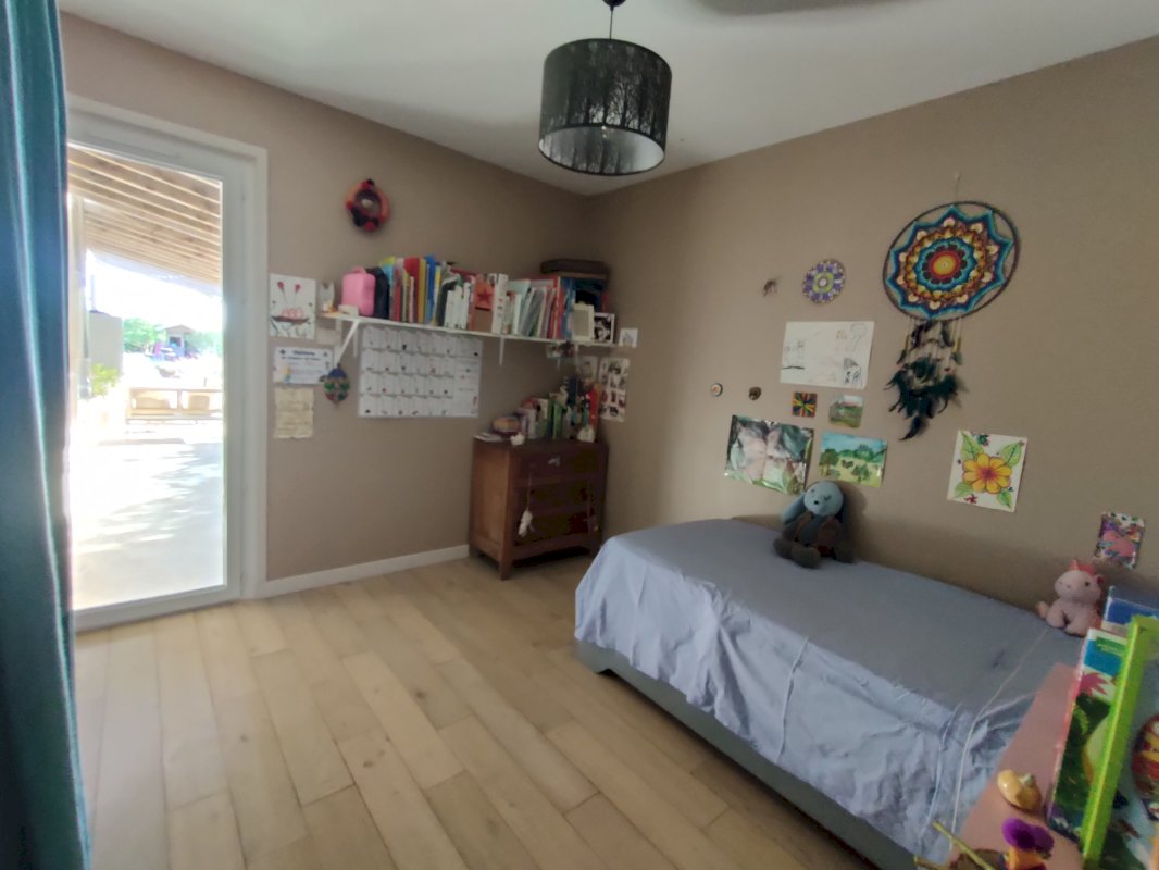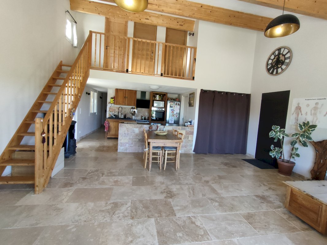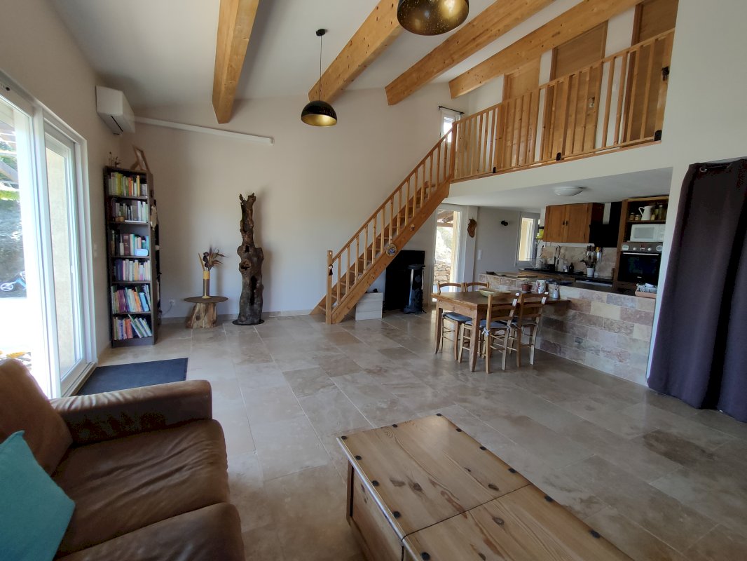 Le bien est composé d’une pièce principale séjour/cuisine ouverte offrant une belle hauteur sous plafond avec poutres apparentes. Orientée Sud, cette pièce de vie débouche, via une grande baie vitrée, sur une terrasse offrant une surface de 70 m², couverte par une pergola. La maison dispose également de 3 chambres (dont une à un accès direct sur la terrasse), d’une salle de bain en travertin, de 2 WC et d’une buanderie.