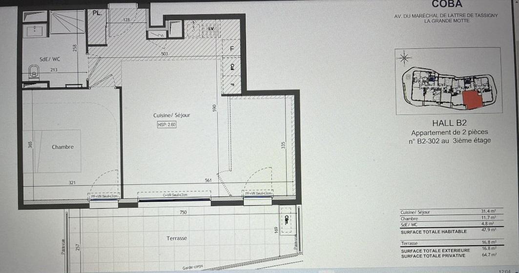Vends appartement T2 Plus 47,80 m² avec terrasse exposition Sud 17,20 m².