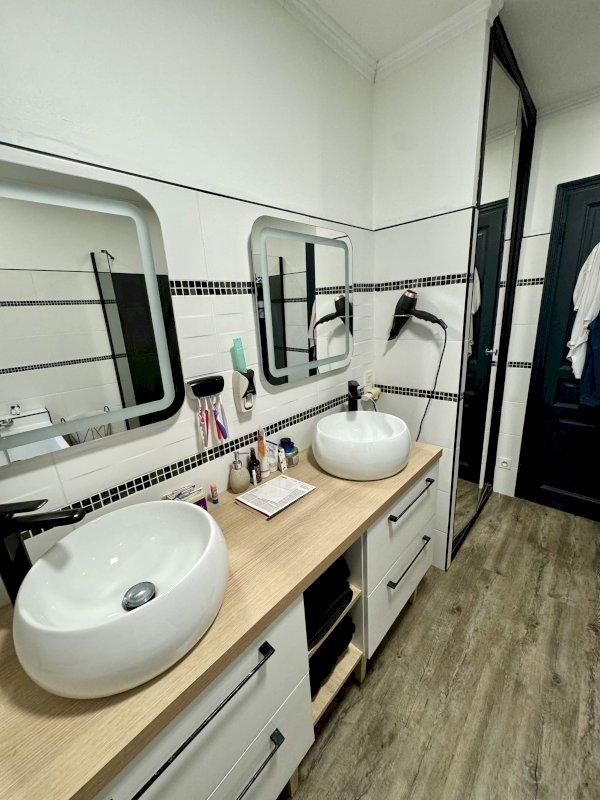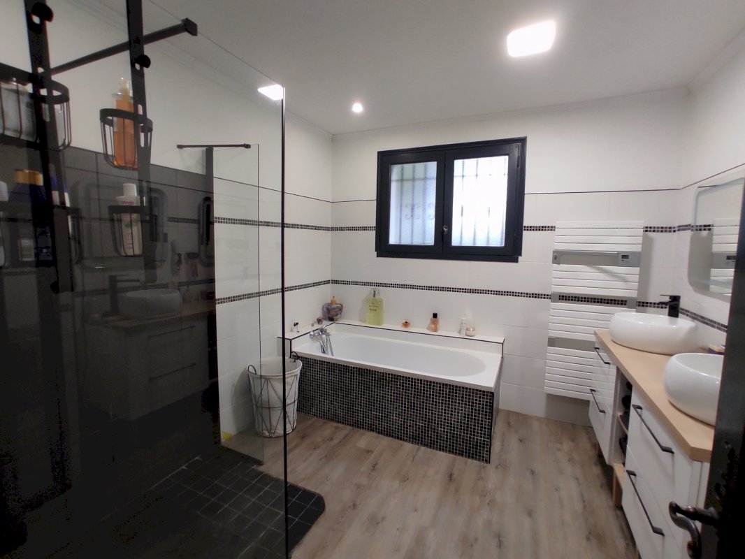 Une salle de bain de 9 m² avec douche à l'italienne, 2 vasques, une baignoire et un placard.