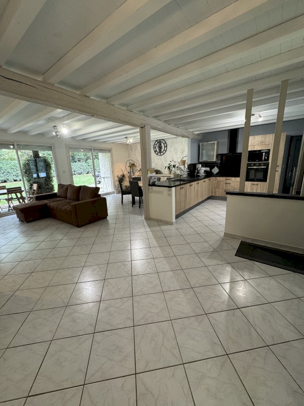 La pièce de vie de 55 m2 composée d'un séjour salon et d'une cuisine ouverte totalement aménagée et équipée (lave vaisselle, four, plaque induction ....).