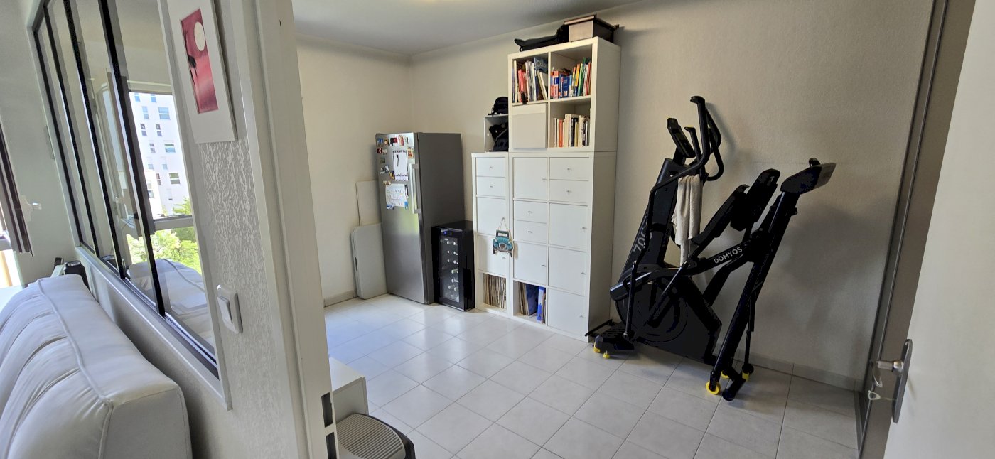 - Une chambre aménagée actuellement en bureau/salle de sport de 12,65 m² avec une belle verrière donnant sur le salon