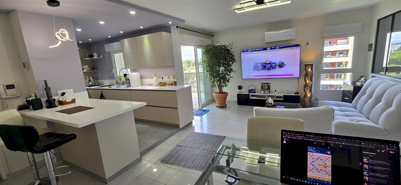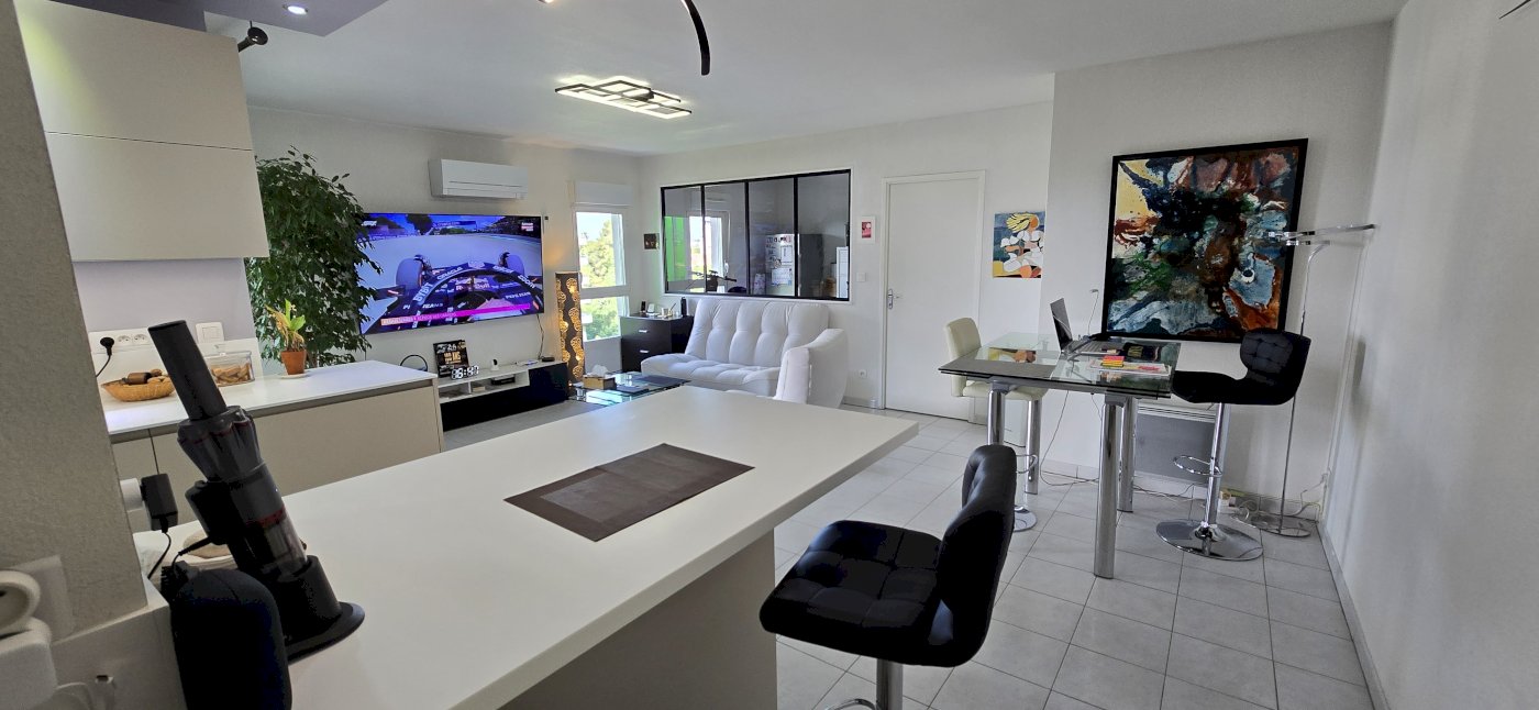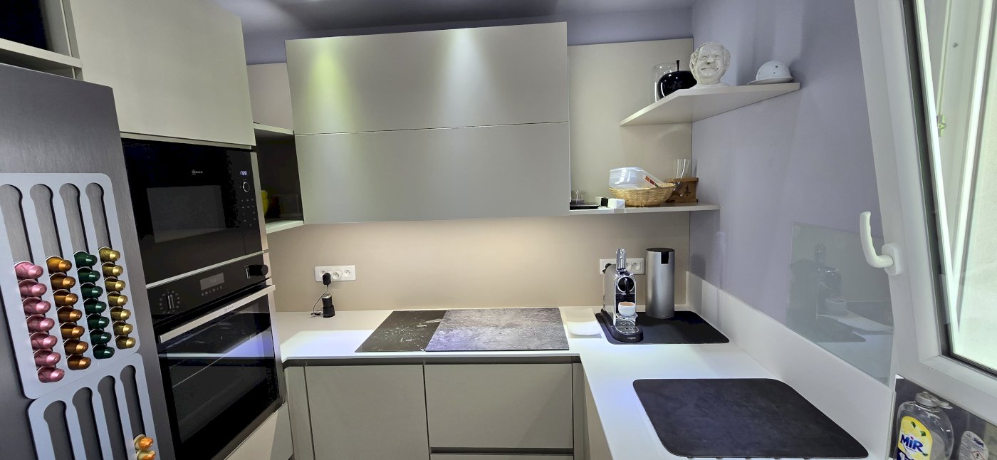 - Un grand séjour de 35 m² avec cuisine neuve ouverte moderne et fonctionnelle aménagée avec des matériaux de qualité (nombreux tiroirs et coffres de rangement, plans de travail et radiateur design en Corian)