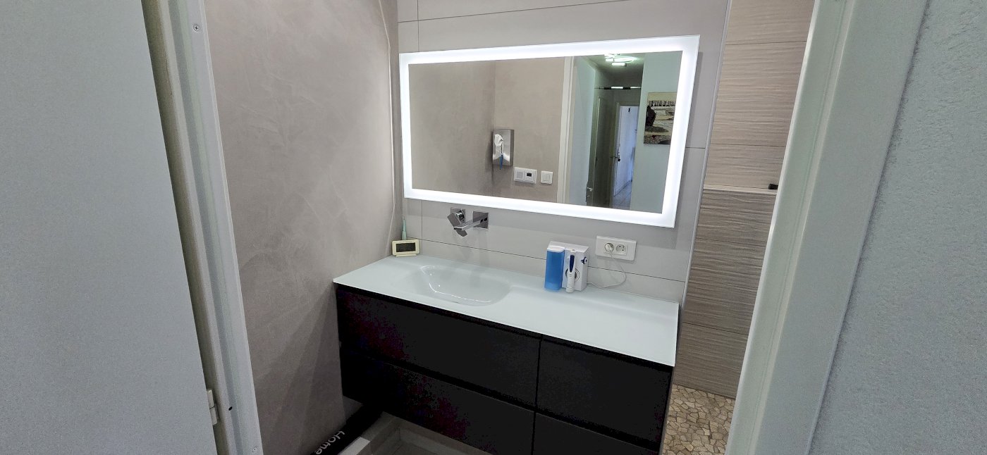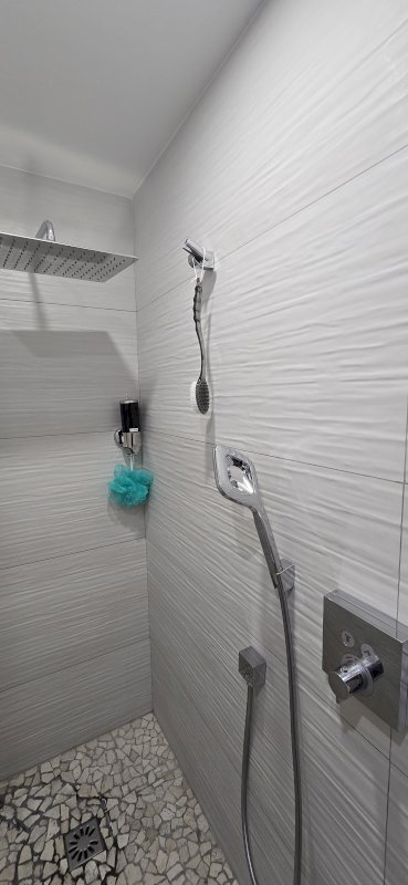 - Une salle d’eau entièrement rénovée avec des matériaux de qualité. Pour le fun, une radio/enceinte connectée est encastrée dans la cloison. Le radiateur est aussi connecté et reçoit une enceinte Bluetooth Cabasse